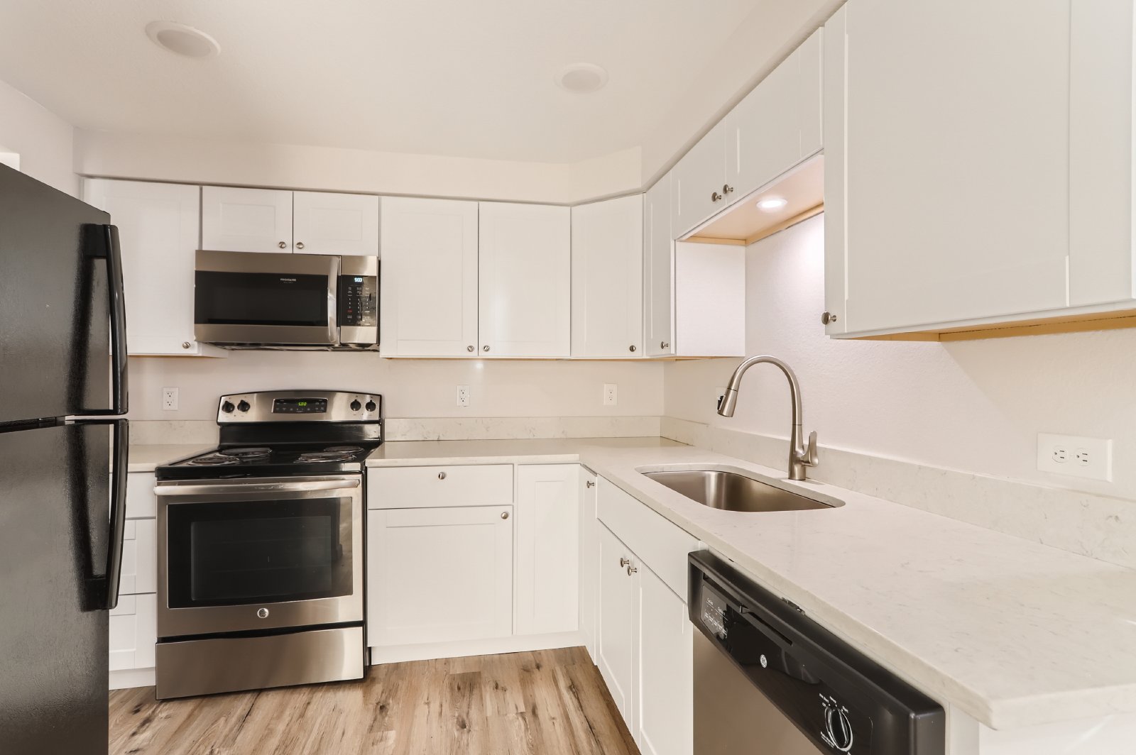 This newly remodeled townhouse-style property features new kitchens, bathrooms, paint, flooring, carpet, and quartz countertops.